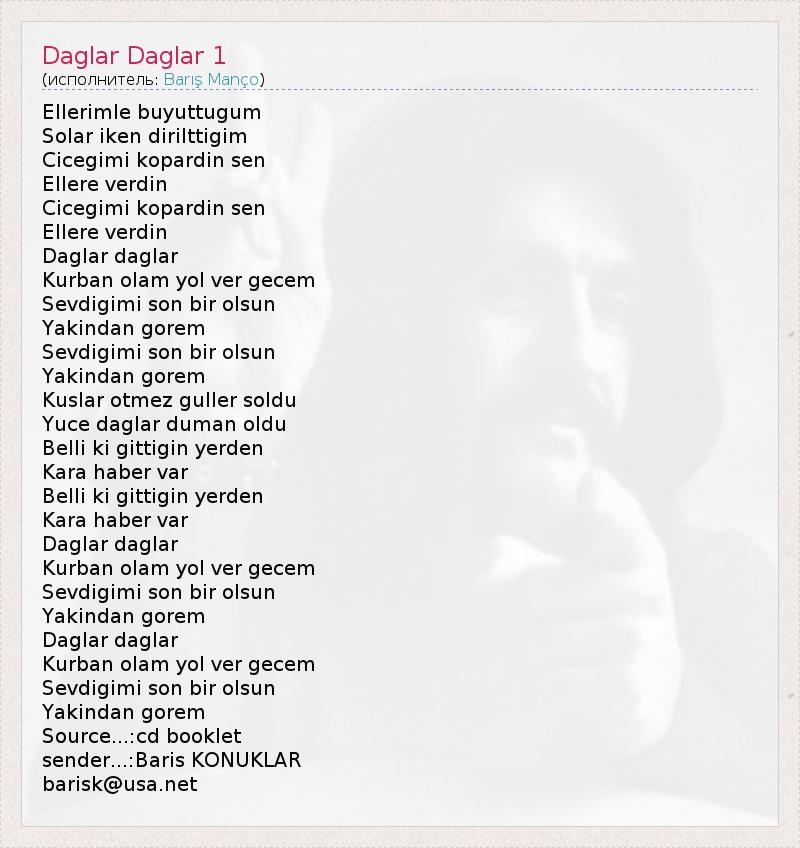 Ellerimle buyuttugum Solar iken dirilttigim Cicegimi kopardin sen Ellere verdin Cicegimi kopardin sen Ellere verdin Daglar daglar Kurban olam yol ver gecem Sevdigimi son bir olsun Yakindan gorem Sevdigimi son bir olsun Yakindan gorem Kuslar otmez guller soldu Yuce daglar duman oldu Belli ki gittigin yerden Kara haber var Belli ki gittigin yerden Kara haber var Daglar daglar Kurban olam yol ver gecem Sevdigimi son bir olsun Yakindan gorem Daglar daglar Kurban olam yol ver gecem Sevdigimi son bir olsun Yakindan gorem Source...:cd booklet sender...:Baris KONUKLAR barisk@usa.net