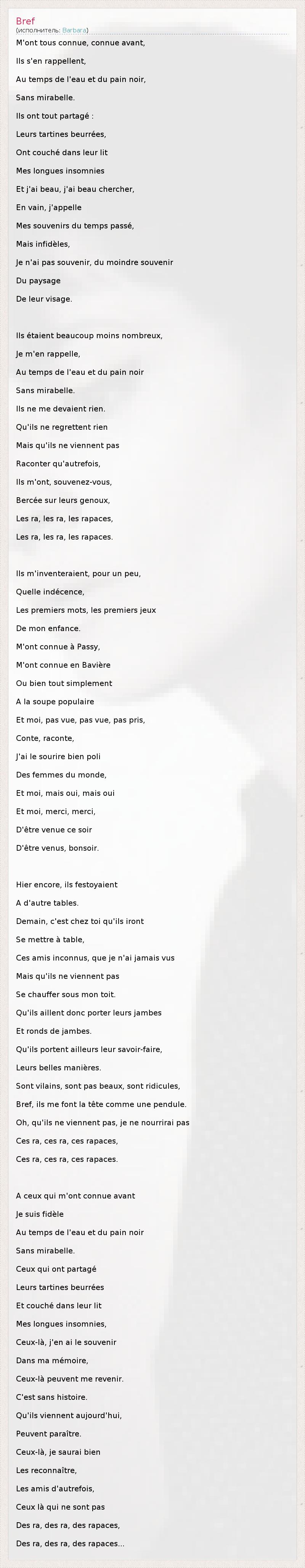 Это интересно:Французская певица Барбара появилась на свет как Моник Серф 9 июня 1930 года в семье отца-эльзасца и матери-еврейки из Одессы. Семья долго скиталась по Франции, пока не осела после войны в Везине. Живший по соседству, учитель пения распознал в девочке музыкальный талант и благодаря его урокам Моник смогла поступить в 1947 году в Ecole Superieure de Musique, где изучала классическую музыку. Тогда же девушка... продолжение