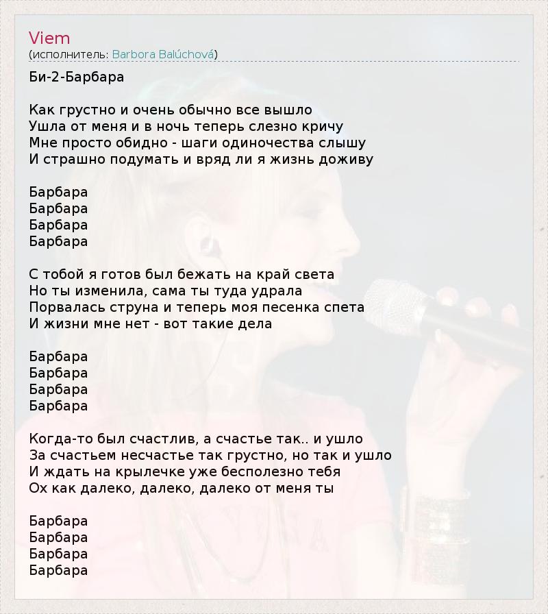 Би-2-Барбара Как грустно и очень обычно все вышло Ушла от меня и в ночь теперь слезно кричу Мне просто обидно - шаги одиночества слышу И страшно подумать и вряд ли я жизнь доживу Барбара Барбара Барбара Барбара С тобой я готов был бежать на край света Но ты изменила, сама ты туда удрала Порвалась струна и теперь моя песенка спета И жизни мне нет - вот такие дела Барбара Барбара Барбара Барбара Когда-то был счастлив, а счастье так.. и ушло За счастьем несчастье так грустно, но так и ушло И ждать на крылечке уже бесполезно тебя Ох как далеко, далеко, далеко от меня ты Барбара Барбара Барбара Барбара