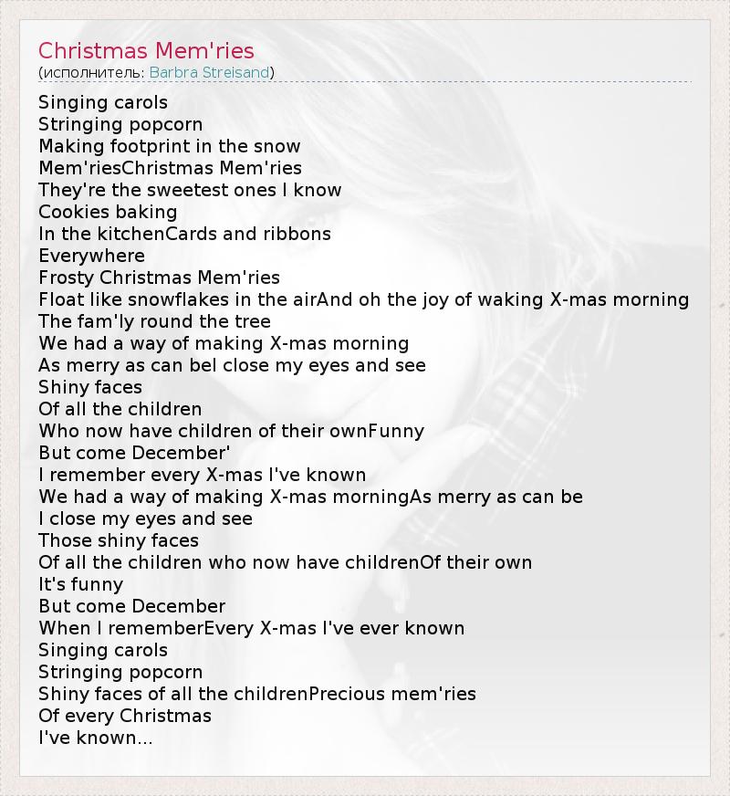 Singing carols Stringing popcorn Making footprint in the snow Mem'riesChristmas Mem'ries They're the sweetest ones I know Cookies baking In the kitchenCards and ribbons Everywhere Frosty Christmas Mem'ries Float like snowflakes in the airAnd oh the joy of waking X-mas morning The fam'ly round the tree We had a way of making X-mas morning As merry as can beI close my eyes and see Shiny faces Of all the children Who now have children of their ownFunny But come December' I remember every X-mas I've known We had a way of making X-mas morningAs merry as can be I close my eyes and see Those shiny faces Of all the children who now have childrenOf their own It's funny But come December When I rememberEvery X-mas I've ever known Singing carols Stringing popcorn Shiny faces of all the childrenPrecious mem'ries Of every Christmas I've known...