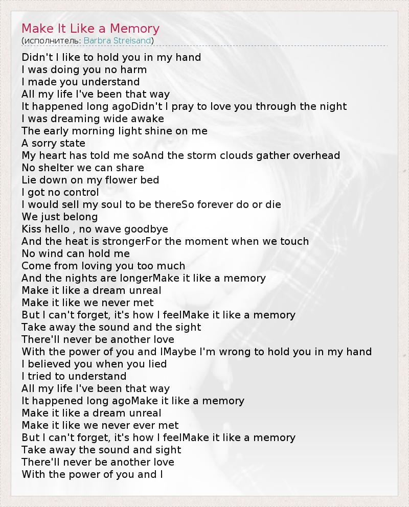 Didn't I like to hold you in my hand I was doing you no harm I made you understand All my life I've been that way It happened long agoDidn't I pray to love you through the night I was dreaming wide awake The early morning light shine on me A sorry state My heart has told me soAnd the storm clouds gather overhead No shelter we can share Lie down on my flower bed I got no control I would sell my soul to be thereSo forever do or die We just belong Kiss hello , no wave goodbye And the heat is strongerFor the moment when we touch No wind can hold me Come from loving you too much And the nights are longerMake it like a memory Make it like a dream unreal Make it like we never met But I can't forget, it's how I feelMake it like a memory Take away the sound and the sight There'll never be another love With the power of you and IMaybe I'm wrong to hold you in my hand I believed you when you lied I tried to understand All my life I've been that way It happened long agoMake it like a memory Make it like a dream unreal Make it like we never ever met But I can't forget, it's how I feelMake it like a memory Take away the sound and sight There'll never be another love With the power of you and I