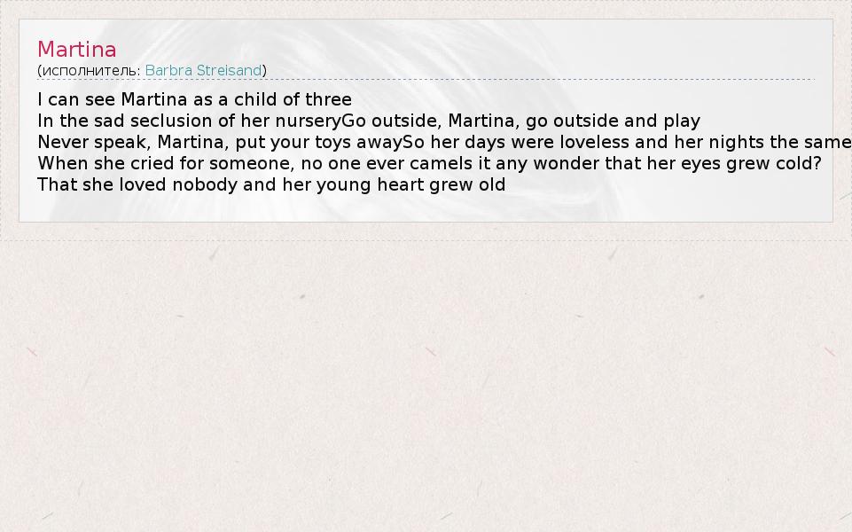 Never speak, Martina, put your toys awaySo her days were loveless and her nights the same
