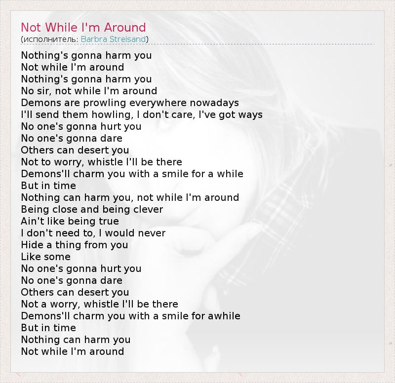 Nothing's gonna harm you Not while I'm around Nothing's gonna harm you No sir, not while I'm around Demons are prowling everywhere nowadays I'll send them howling, I don't care, I've got ways No one's gonna hurt you No one's gonna dare Others can desert you Not to worry, whistle I'll be there Demons'll charm you with a smile for a while But in time Nothing can harm you, not while I'm around Being close and being clever Ain't like being true I don't need to, I would never Hide a thing from you Like some No one's gonna hurt you No one's gonna dare Others can desert you Not a worry, whistle I'll be there Demons'll charm you with a smile for awhile But in time Nothing can harm you Not while I'm around