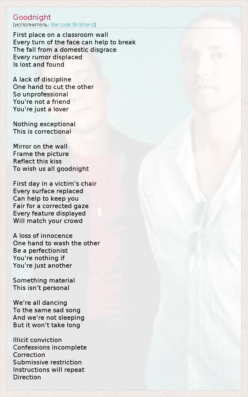 Первое место на стене класса. Каждый поворот лица способен остановить Падение с внутреннего позора. Каждый вытесненный слух Потерян и найден. Отсутствие дисциплины. Одна рука режет другую. Так непрофессионально. Ты – не друг, Ты – лишь любовник. Ничего необычного, Это исправительно. Зеркало на стене, Рама картины, Отрази этот поцелуй, Чтобы пожелать нам всем спокойной ночи. Первый день на месте жертвы. Каждая измененная внешность Может помочь сделать тебя Порядочным для надзирателя. Каждая показанная особенность Подойдет твоему стаду. Потеря невинности. Одна рука омывает другую. Будь перфекционистом. Ты – ничто, Если ты – лишь другой. Что-то материальное, Ничего личного. Мы все танцуем Под одну и ту же грустную песню. Мы не спим, Но это не продлится долго. Несправедливое обвинение, Незавершенные признания, Исправление, Послушное ограничение, Инструкции повторят Предписание.