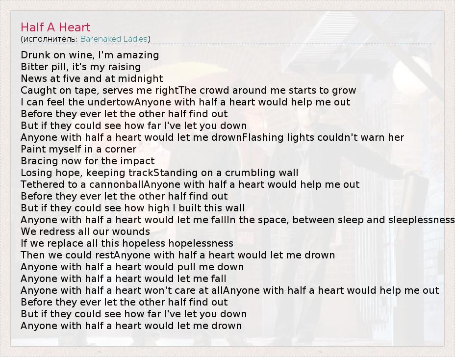 А как ты думаешь, о чем песня "Half A Heart" ?