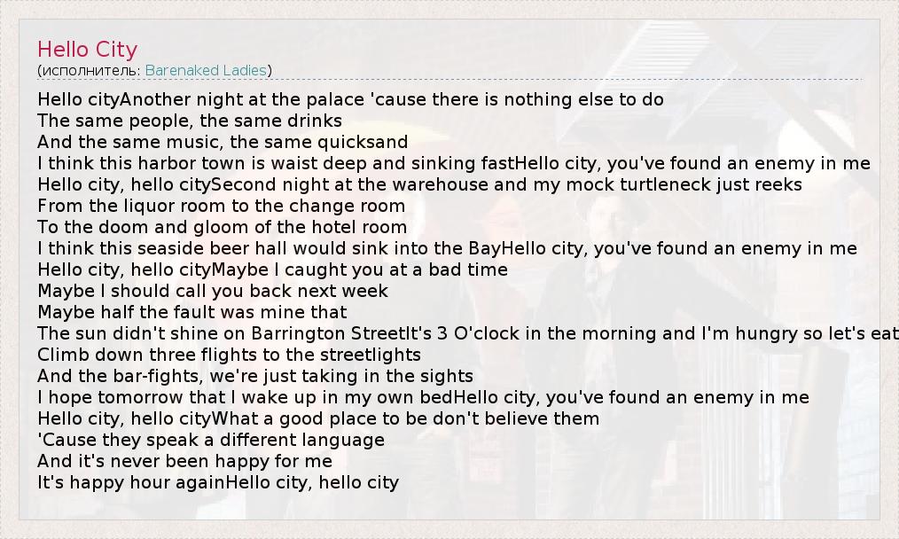 Это интересно:Barenaked Ladies (англ. Обнажённые дамы ) — канадская альтернативная рок-группа, которая была организована в 1988 году в пригороде Торонто. Они известны своими полушутливыми хитами «One Week» (первое место в США, 1998), «If I Had $1000000» и другими, которые исполняются на концертах и в клипах в комической манере. Исполнение песен на живых выступлениях перемежается юмористической болтовней и импровизированным... продолжение