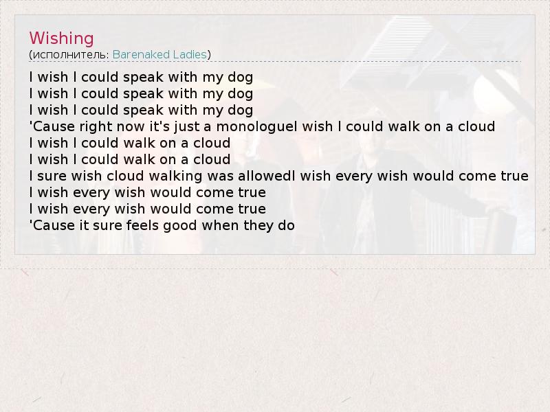 I wish I could speak with my dog I wish I could speak with my dog I wish I could speak with my dog 'Cause right now it's just a monologueI wish I could walk on a cloud I wish I could walk on a cloud I wish I could walk on a cloud I sure wish cloud walking was allowedI wish every wish would come true I wish every wish would come true I wish every wish would come true 'Cause it sure feels good when they do