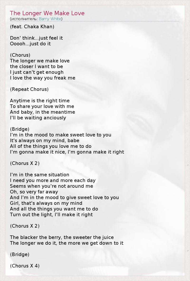 (feat. Chaka Khan) Don' think...just feel it Ooooh...just do it (Chorus) The longer we make love the closer I want to be I just can't get enough I love the way you freak me (Repeat Chorus) Anytime is the right time To share your love with me And baby, in the meantime I'll be waiting anciously (Bridge) I'm in the mood to make sweet love to you It's always on my mind, babe All of the things you love me to do I'm gonna make it nice, I'm gonna make it right (Chorus X 2) I'm in the same situation I need you more and more each day Seems when you're not around me Oh, so very far away And I'm in the mood to give sweet love to you Girl, that's always on my mind And all the things you want me to do Turn out the light, I'll make it right (Chorus X 2) The blacker the berry, the sweeter the juice The longer we do it, the more we get down to it (Bridge) (Chorus X 4)
