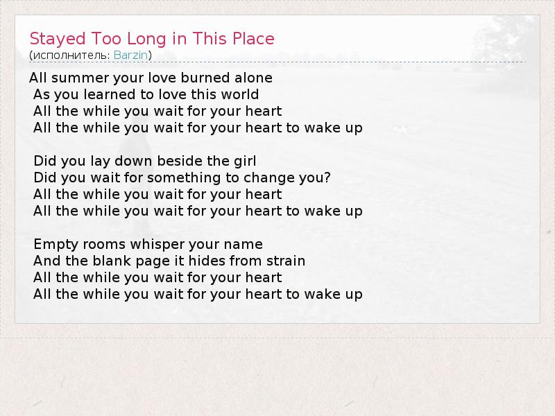 А как ты думаешь, о чем песня "Stayed Too Long in This Place" ?