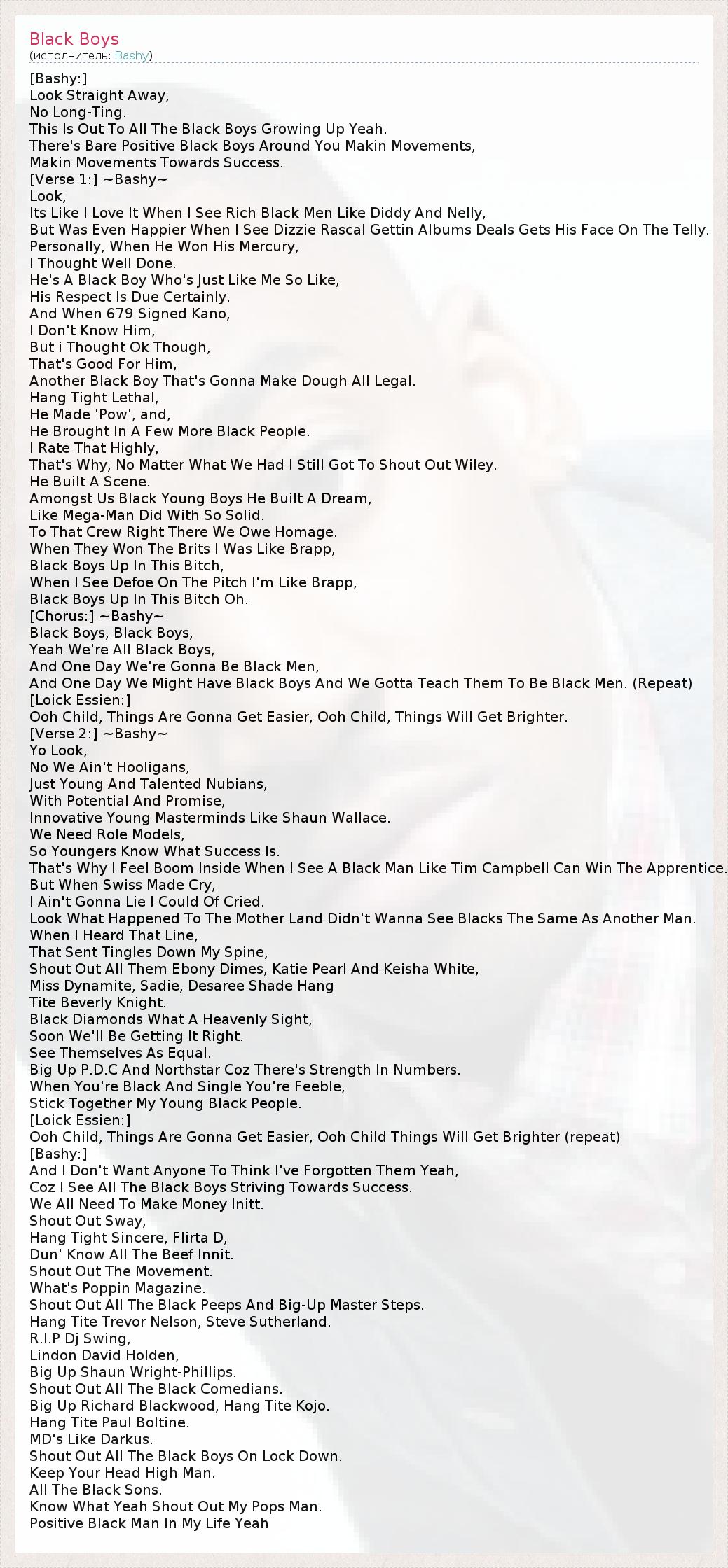 [Bashy:] Look Straight Away, No Long-Ting. This Is Out To All The Black Boys Growing Up Yeah. There's Bare Positive Black Boys Around You Makin Movements, Makin Movements Towards Success. [Verse 1:] ~Bashy~ Look, Its Like I Love It When I See Rich Black Men Like Diddy And Nelly, But Was Even Happier When I See Dizzie Rascal Gettin Albums Deals Gets His Face On The Telly. Personally, When He Won His Mercury, I Thought Well Done. He's A Black Boy Who's Just Like Me So Like, His Respect Is Due Certainly. And When 679 Signed Kano, I Don't Know Him, But i Thought Ok Though, That's Good For Him, Another Black Boy That's Gonna Make Dough All Legal. Hang Tight Lethal, He Made 'Pow', and, He Brought In A Few More Black People. I Rate That Highly, That's Why, No Matter What We Had I Still Got To Shout Out Wiley. He Built A Scene. Amongst Us Black Young Boys He Built A Dream, Like Mega-Man Did With So Solid. To That Crew Right There We Owe Homage. When They Won The Brits I Was Like Brapp, Black Boys Up In This Bitch, When I See Defoe On The Pitch I'm Like Brapp, Black Boys Up In This Bitch Oh. [Chorus:] ~Bashy~ Black Boys, Black Boys, Yeah We're All Black Boys, And One Day We're Gonna Be Black Men, And One Day We Might Have Black Boys And We Gotta Teach Them To Be Black Men. (Repeat) [Loick Essien:] Ooh Child, Things Are Gonna Get Easier, Ooh Child, Things Will Get Brighter. [Verse 2:] ~Bashy~ Yo Look, No We Ain't Hooligans, Just Young And Talented Nubians, With Potential And Promise, Innovative Young Masterminds Like Shaun Wallace. We Need Role Models, So Youngers Know What Success Is. That's Why I Feel Boom Inside When I See A Black Man Like Tim Campbell Can Win The Apprentice. But When Swiss Made Cry, I Ain't Gonna Lie I Could Of Cried. Look What Happened To The Mother Land Didn't Wanna See Blacks The Same As Another Man. When I Heard That Line, That Sent Tingles Down My Spine, Shout Out All Them Ebony Dimes, Katie Pearl And Keisha White, Miss Dynamite, Sadie, Desaree Shade Hang Tite Beverly Knight. Black Diamonds What A Heavenly Sight, Soon We'll Be Getting It Right. See Themselves As Equal. Big Up P.D.C And Northstar Coz There's Strength In Numbers. When You're Black And Single You're Feeble, Stick Together My Young Black People. [Loick Essien:] Ooh Child, Things Are Gonna Get Easier, Ooh Child Things Will Get Brighter (repeat) [Bashy:] And I Don't Want Anyone To Think I've Forgotten Them Yeah, Coz I See All The Black Boys Striving Towards Success. We All Need To Make Money Initt. Shout Out Sway, Hang Tight Sincere, Flirta D, Dun' Know All The Beef Innit. Shout Out The Movement. What's Poppin Magazine. Shout Out All The Black Peeps And Big-Up Master Steps. Hang Tite Trevor Nelson, Steve Sutherland. R.I.P Dj Swing, Lindon David Holden, Big Up Shaun Wright-Phillips. Shout Out All The Black Comedians. Big Up Richard Blackwood, Hang Tite Kojo. Hang Tite Paul Boltine. MD's Like Darkus. Shout Out All The Black Boys On Lock Down. Keep Your Head High Man. All The Black Sons. Know What Yeah Shout Out My Pops Man. Positive Black Man In My Life Yeah