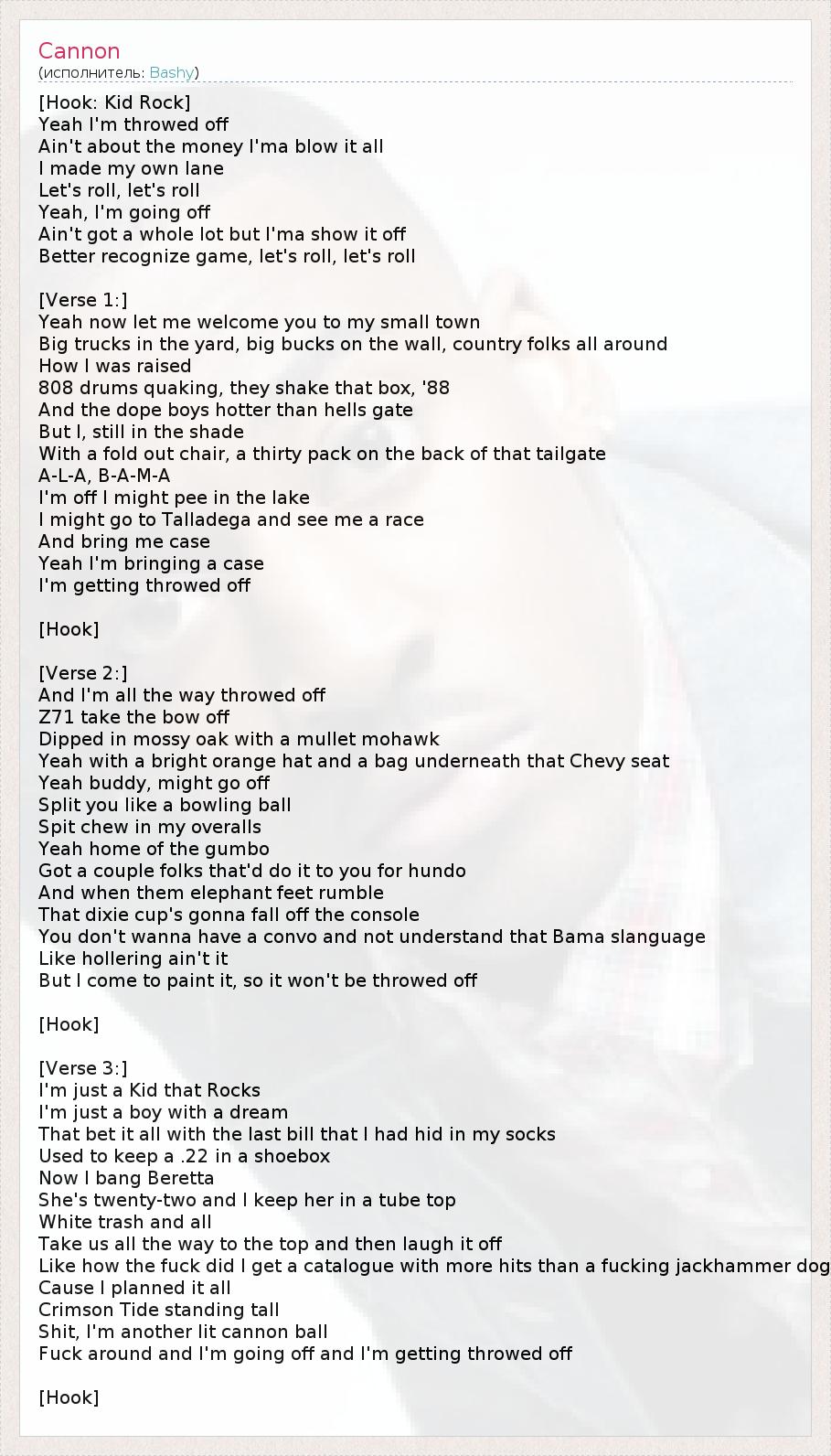[Hook: Kid Rock] Yeah I'm throwed off Ain't about the money I'ma blow it all I made my own lane Let's roll, let's roll Yeah, I'm going off Ain't got a whole lot but I'ma show it off Better recognize game, let's roll, let's roll [Verse 1:] Yeah now let me welcome you to my small town Big trucks in the yard, big bucks on the wall, country folks all around How I was raised 808 drums quaking, they shake that box, '88 And the dope boys hotter than hells gate But I, still in the shade With a fold out chair, a thirty pack on the back of that tailgate A-L-A, B-A-M-A I'm off I might pee in the lake I might go to Talladega and see me a race And bring me case Yeah I'm bringing a case I'm getting throwed off [Hook] [Verse 2:] And I'm all the way throwed off Z71 take the bow off Dipped in mossy oak with a mullet mohawk Yeah with a bright orange hat and a bag underneath that Chevy seat Yeah buddy, might go off Split you like a bowling ball Spit chew in my overalls Yeah home of the gumbo Got a couple folks that'd do it to you for hundo And when them elephant feet rumble That dixie cup's gonna fall off the console You don't wanna have a convo and not understand that Bama slanguage Like hollering ain't it But I come to paint it, so it won't be throwed off [Hook] [Verse 3:] I'm just a Kid that Rocks I'm just a boy with a dream That bet it all with the last bill that I had hid in my socks Used to keep a .22 in a shoebox Now I bang Beretta She's twenty-two and I keep her in a tube top White trash and all Take us all the way to the top and then laugh it off Like how the fuck did I get a catalogue with more hits than a fucking jackhammer dog Cause I planned it all Crimson Tide standing tall Shit, I'm another lit cannon ball Fuck around and I'm going off and I'm getting throwed off [Hook]