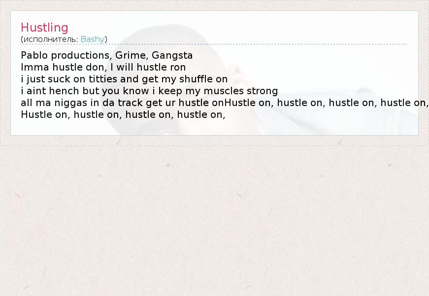 Pablo productions, Grime, Gangsta Imma hustle don, I will hustle ron i just suck on titties and get my shuffle on i aint hench but you know i keep my muscles strong all ma niggas in da track get ur hustle onHustle on, hustle on, hustle on, hustle on, Hustle on, hustle on, hustle on, hustle on,