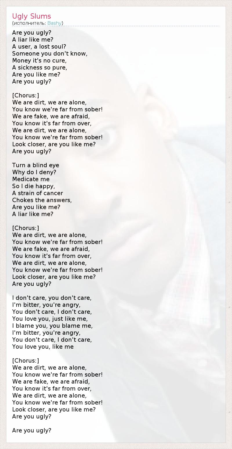 Ты уродлив? Лжец, как я? Наркоман, потерянная душа? Кто–то, кого ты не знаешь, Деньги – это не лекарство, Болезнь настолько чиста, Ты такой же, как я? Ты уродлив? [Припев:] Мы – отбросы, одиноки, Ты знаешь, мы далеко не трезвые! Мы – подделки, мы напуганы, Ты знаешь, до конца очень далеко, Мы – отбросы, одиноки, Ты знаешь, мы далеко не трезвые! Вглядись поближе, ты такой же, как я? Ты уродлив? Не обращай внимания, Почему я отрицаю? Напичкай меня лекарствами, Так я хоть умру счастливым, Рак Душит ответы, Ты такой же, как я? Лжец, как я? [Припев:] Мы – отбросы, одиноки, Ты знаешь, мы далеко не трезвые! Мы – подделки, мы напуганы, Ты знаешь, до конца очень далеко, Мы – отбросы, одиноки, Ты знаешь, мы далеко не трезвые! Вглядись поближе, ты такой же, как я? Ты уродлив? Мне плевать, тебе плевать, Я жестокий, ты злой, Тебе плевать, мне плевать, Ты любишь себя, прямо как я, Я виню тебя, ты винишь меня, Я жестокий, ты злой, Тебе плевать, мне плевать, Ты любишь себя, как я [Припев:] Мы – отбросы, одиноки, Ты знаешь, мы далеко не трезвые! Мы – подделки, мы напуганы, Ты знаешь, до конца очень далеко, Мы – отбросы, одиноки, Ты знаешь, мы далеко не трезвые! Вглядись поближе, ты такой же, как я? Ты уродлив? Ты уродлив?