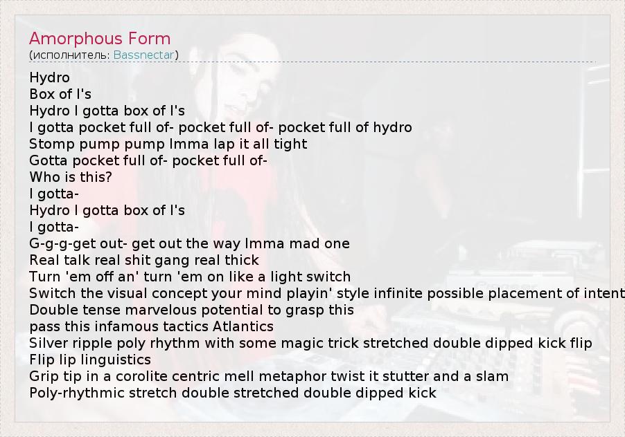 Hydro Box of l's Hydro I gotta box of l's I gotta pocket full of- pocket full of- pocket full of hydro Stomp pump pump Imma lap it all tight Gotta pocket full of- pocket full of- Who is this? I gotta- Hydro I gotta box of l's I gotta- G-g-g-get out- get out the way Imma mad one Real talk real shit gang real thick Turn 'em off an' turn 'em on like a light switch Switch the visual concept your mind playin' style infinite possible placement of intent Double tense marvelous potential to grasp this pass this infamous tactics Atlantics Silver ripple poly rhythm with some magic trick stretched double dipped kick flip Flip lip linguistics Grip tip in a corolite centric mell metaphor twist it stutter and a slam Poly-rhythmic stretch double stretched double dipped kick