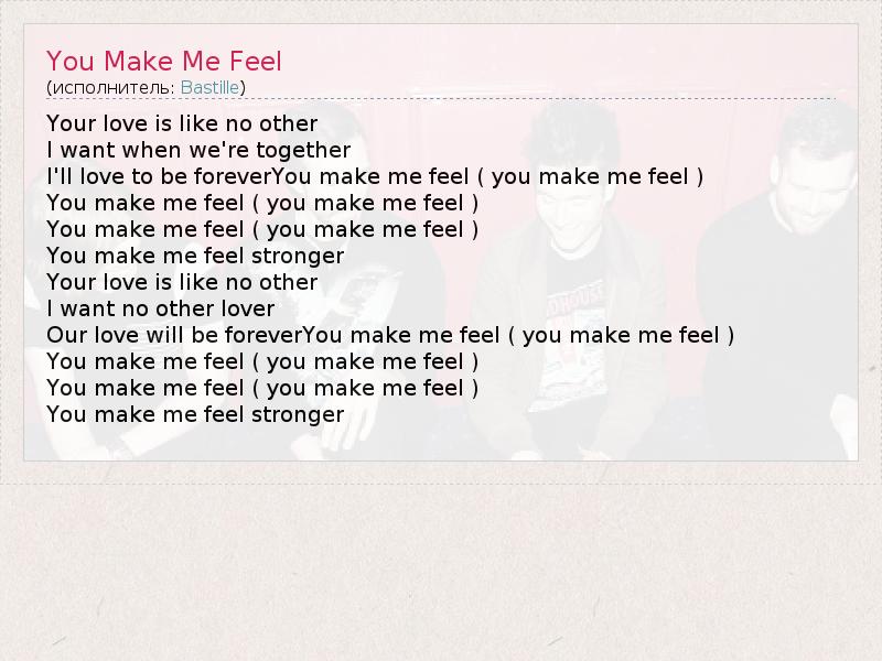 А как ты думаешь, о чем песня "You Make Me Feel" ?