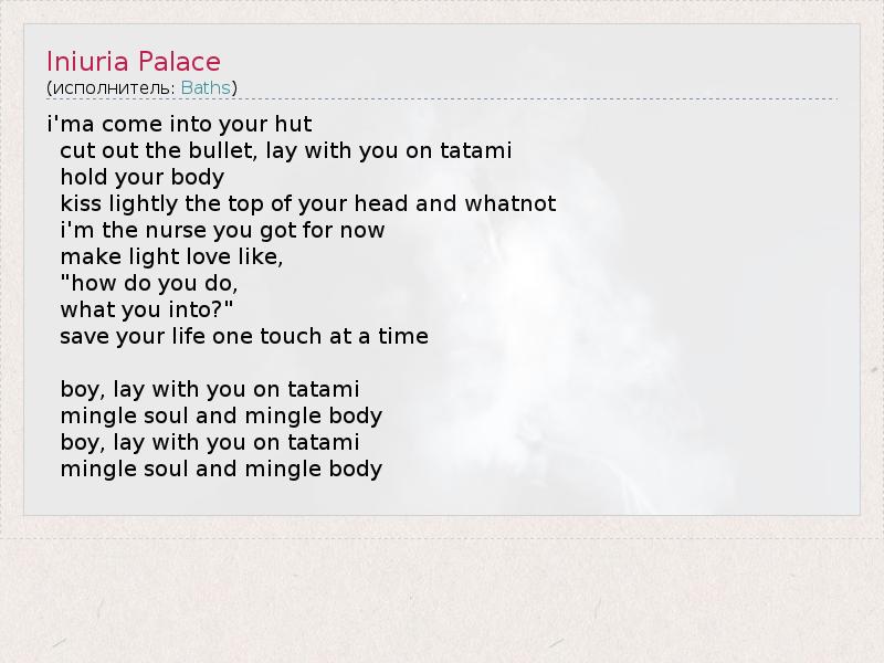 i'ma come into your hut cut out the bullet, lay with you on tatami hold your body kiss lightly the top of your head and whatnot i'm the nurse you got for now make light love like, "how do you do, what you into?" save your life one touch at a time boy, lay with you on tatami mingle soul and mingle body boy, lay with you on tatami mingle soul and mingle body