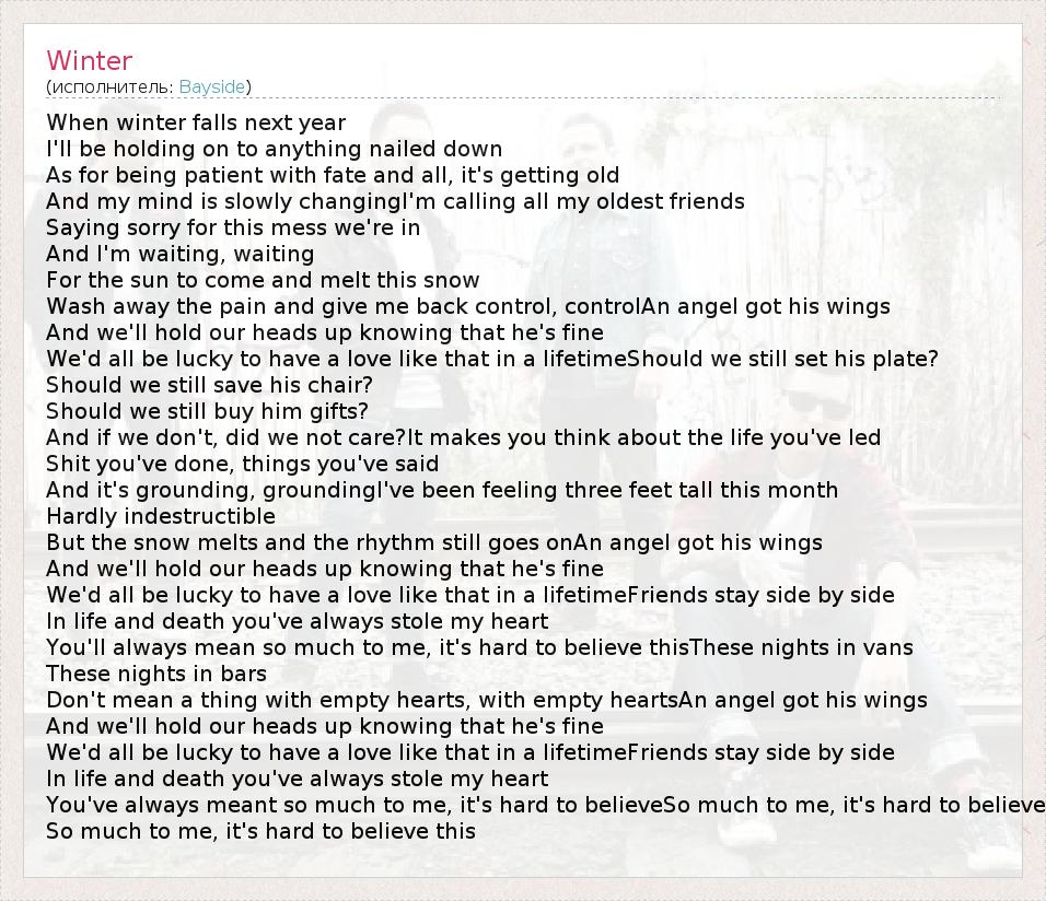 When winter falls next year I'll be holding on to anything nailed down As for being patient with fate and all, it's getting old And my mind is slowly changingI'm calling all my oldest friends Saying sorry for this mess we're in And I'm waiting, waiting For the sun to come and melt this snow Wash away the pain and give me back control, controlAn angel got his wings And we'll hold our heads up knowing that he's fine We'd all be lucky to have a love like that in a lifetimeShould we still set his plate? Should we still save his chair? Should we still buy him gifts? And if we don't, did we not care?It makes you think about the life you've led Shit you've done, things you've said And it's grounding, groundingI've been feeling three feet tall this month Hardly indestructible But the snow melts and the rhythm still goes onAn angel got his wings And we'll hold our heads up knowing that he's fine We'd all be lucky to have a love like that in a lifetimeFriends stay side by side In life and death you've always stole my heart You'll always mean so much to me, it's hard to believe thisThese nights in vans These nights in bars Don't mean a thing with empty hearts, with empty heartsAn angel got his wings And we'll hold our heads up knowing that he's fine We'd all be lucky to have a love like that in a lifetimeFriends stay side by side In life and death you've always stole my heart You've always meant so much to me, it's hard to believeSo much to me, it's hard to believe So much to me, it's hard to believe this