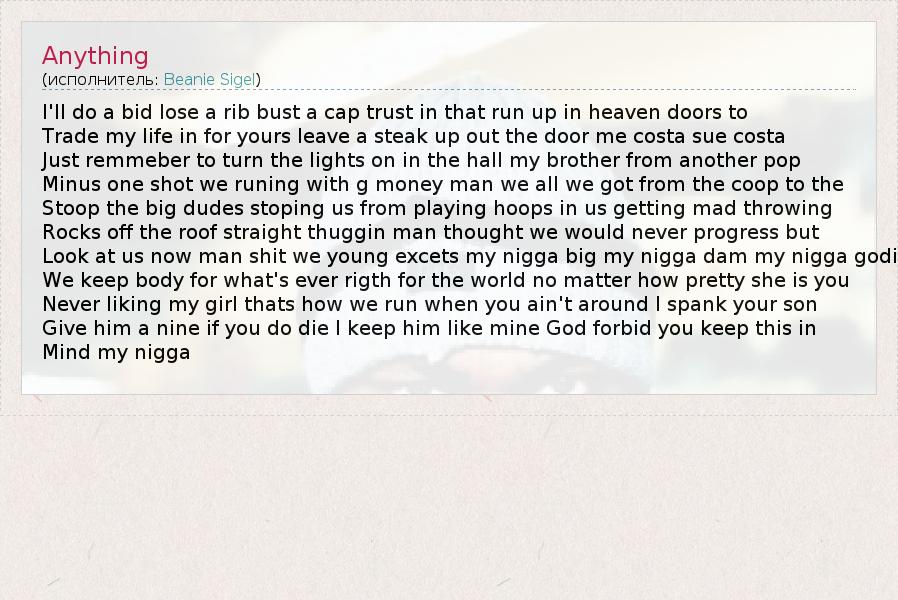 Это интересно:С самого начала своей карьеры Beanie Sigel славен не только качеством своей лирики, но и правдивостью сюжетов. В дни, когда толпы рэпперов бахвалятся друг перед другом и пускают золотую пыль в глаза слушателей, он один из немногих, кто говорит о том, что пережил на самом деле. А пережил он немало. К пай-мальчикам рэппер никогда не относился и в его биографии много страниц, которые вряд ли вызывают... продолжение