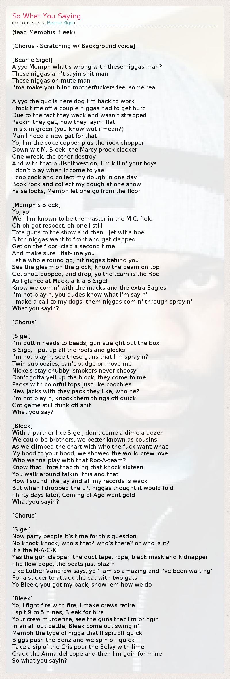 Это интересно:С самого начала своей карьеры Beanie Sigel славен не только качеством своей лирики, но и правдивостью сюжетов. В дни, когда толпы рэпперов бахвалятся друг перед другом и пускают золотую пыль в глаза слушателей, он один из немногих, кто говорит о том, что пережил на самом деле. А пережил он немало. К пай-мальчикам рэппер никогда не относился и в его биографии много страниц, которые вряд ли вызывают... продолжение