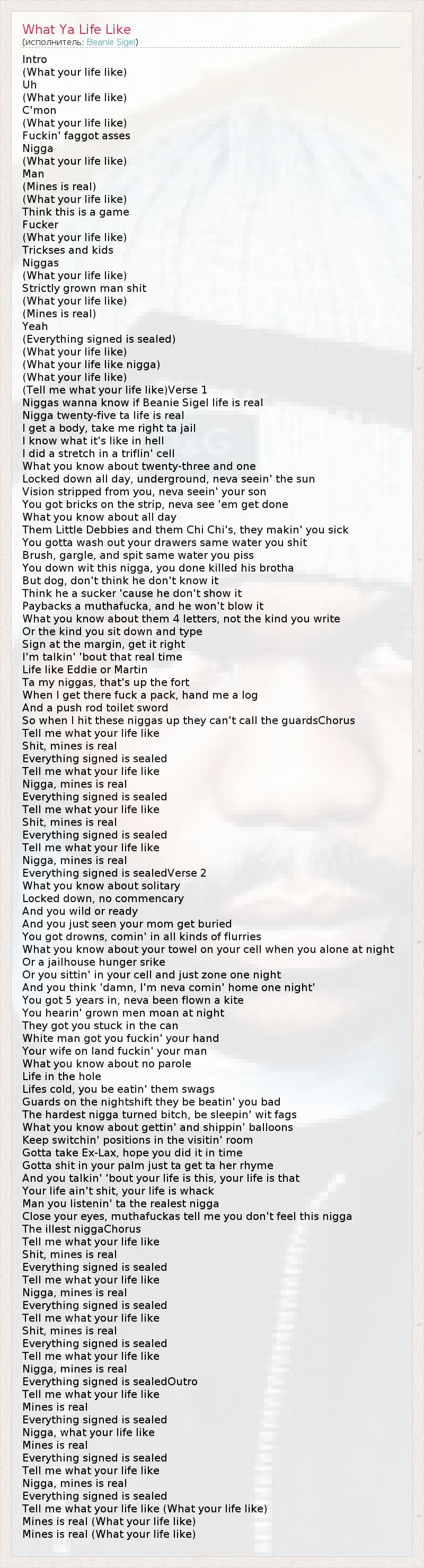 Intro (What your life like) Uh (What your life like) C'mon (What your life like) Fuckin' faggot asses Nigga (What your life like) Man (Mines is real) (What your life like) Think this is a game Fucker (What your life like) Trickses and kids Niggas (What your life like) Strictly grown man shit (What your life like) (Mines is real) Yeah (Everything signed is sealed) (What your life like) (What your life like nigga) (What your life like) (Tell me what your life like)Verse 1 Niggas wanna know if Beanie Sigel life is real Nigga twenty-five ta life is real I get a body, take me right ta jail I know what it's like in hell I did a stretch in a triflin' cell What you know about twenty-three and one Locked down all day, underground, neva seein' the sun Vision stripped from you, neva seein' your son You got bricks on the strip, neva see 'em get done What you know about all day Them Little Debbies and them Chi Chi's, they makin' you sick You gotta wash out your drawers same water you shit Brush, gargle, and spit same water you piss You down wit this nigga, you done killed his brotha But dog, don't think he don't know it Think he a sucker 'cause he don't show it Paybacks a muthafucka, and he won't blow it What you know about them 4 letters, not the kind you write Or the kind you sit down and type Sign at the margin, get it right I'm talkin' 'bout that real time Life like Eddie or Martin Ta my niggas, that's up the fort When I get there fuck a pack, hand me a log And a push rod toilet sword So when I hit these niggas up they can't call the guardsChorus Tell me what your life like Shit, mines is real Everything signed is sealed Tell me what your life like Nigga, mines is real Everything signed is sealed Tell me what your life like Shit, mines is real Everything signed is sealed Tell me what your life like Nigga, mines is real Everything signed is sealedVerse 2 What you know about solitary Locked down, no commencary And you wild or ready And you just seen your mom get buried You got drowns, comin' in all kinds of flurries What you know about your towel on your cell when you alone at night Or a jailhouse hunger srike Or you sittin' in your cell and just zone one night And you think 'damn, I'm neva comin' home one night' You got 5 years in, neva been flown a kite You hearin' grown men moan at night They got you stuck in the can White man got you fuckin' your hand Your wife on land fuckin' your man What you know about no parole Life in the hole Lifes cold, you be eatin' them swags Guards on the nightshift they be beatin' you bad The hardest nigga turned bitch, be sleepin' wit fags What you know about gettin' and shippin' balloons Keep switchin' positions in the visitin' room Gotta take Ex-Lax, hope you did it in time Gotta shit in your palm just ta get ta her rhyme And you talkin' 'bout your life is this, your life is that Your life ain't shit, your life is whack Man you listenin' ta the realest nigga Close your eyes, muthafuckas tell me you don't feel this nigga The illest niggaChorus Tell me what your life like Shit, mines is real Everything signed is sealed Tell me what your life like Nigga, mines is real Everything signed is sealed Tell me what your life like Shit, mines is real Everything signed is sealed Tell me what your life like Nigga, mines is real Everything signed is sealedOutro Tell me what your life like Mines is real Everything signed is sealed Nigga, what your life like Mines is real Everything signed is sealed Tell me what your life like Nigga, mines is real Everything signed is sealed Tell me what your life like (What your life like) Mines is real (What your life like) Mines is real (What your life like)