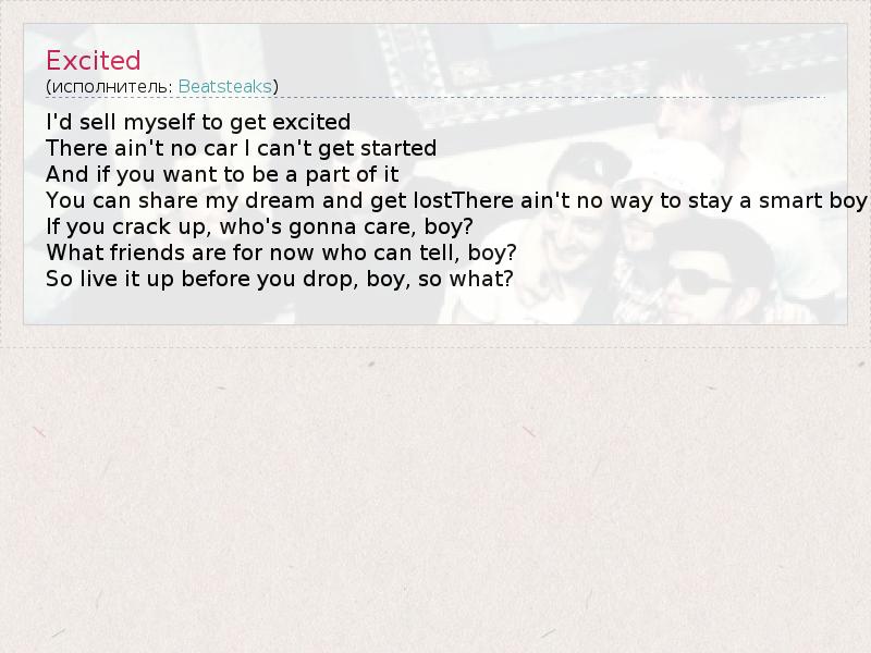 I'd sell myself to get excited There ain't no car I can't get started And if you want to be a part of it You can share my dream and get lostThere ain't no way to stay a smart boy If you crack up, who's gonna care, boy? What friends are for now who can tell, boy? So live it up before you drop, boy, so what?