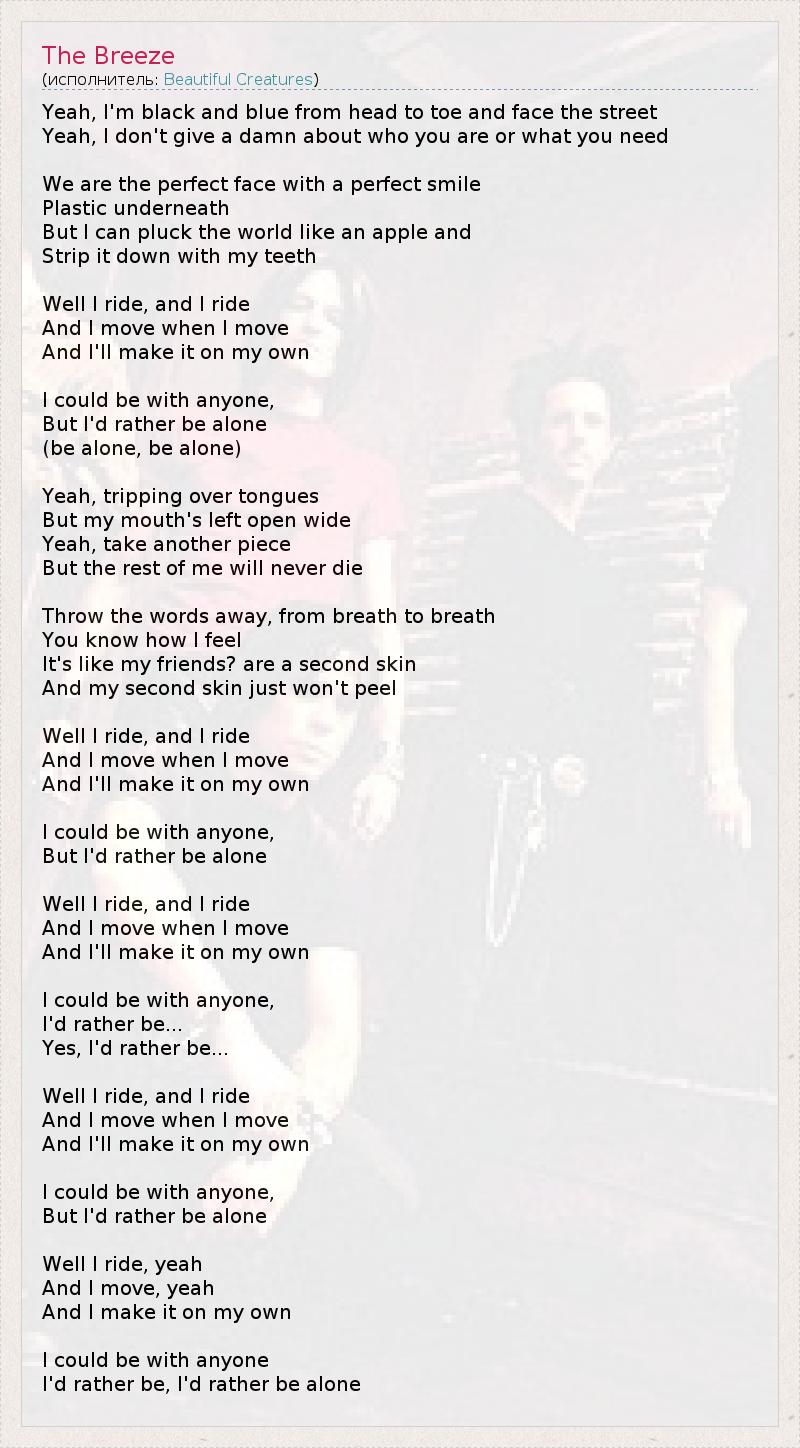 Это интересно:Старый добрый рок-н-ролл был возвращен к жизни в 1999 году командой из Лос-Анджелеса "Beautiful creatures". Позаимствовав некоторые моменты у "AC/DC", "Motley crue" и "Guns N'Roses" времен "Appetite for destruction", пятеро американцев выдали осовремененную версию классического рока. Ядро группы составили вокалист Джо Лесте и гитарист DJ Ашба. Лесте до этого работал с "Bang tango", на короткое время... продолжение