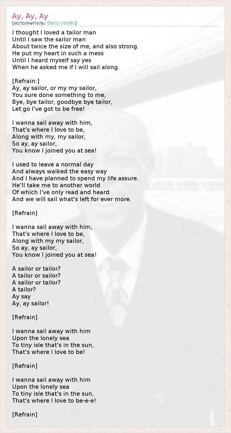 I thought I loved a tailor man Until I saw the sailor man About twice the size of me, and also strong. He put my heart in such a mess Until I heard myself say yes When he asked me if I will sail along. [Refrain:] Ay, ay sailor, or my my sailor, You sure done something to me, Bye, bye tailor, goodbye bye tailor, Let go I've got to be free! I wanna sail away with him, That's where I love to be, Along with my, my sailor, So ay, ay sailor, You know I joined you at sea! I used to leave a normal day And always walked the easy way And I have planned to spend my life assure. He'll take me to another world Of which I've only read and heard And we will sail what's left for ever more. [Refrain] I wanna sail away with him, That's where I love to be, Along with my my sailor, So ay, ay sailor, You know I joined you at sea! A sailor or tailor? A tailor or sailor? A sailor or tailor? A tailor? Ay say Ay, ay sailor! [Refrain] I wanna sail away with him Upon the lonely sea To tiny isle that's in the sun, That's where I love to be! [Refrain] I wanna sail away with him Upon the lonely sea To tiny isle that's in the sun, That's where I love to be-e-e! [Refrain]