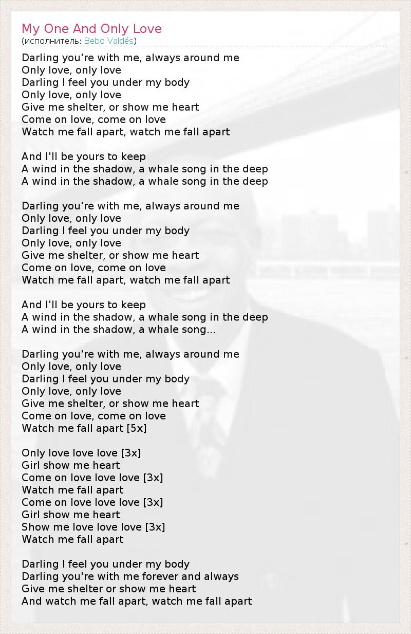 Милая, ты со мной, всегда рядом со мной. Лишь любовь, лишь любовь... Милая, я чувствую тебя под своим телом. Лишь любовь, лишь любовь... Приюти меня или открой мне свое сердце, Ну же, любимая, ну же, любимая... Посмотри, я теряю голову, посмотри, я теряю голову... Я всегда буду твоим, Ветром в тени, песней кита в морской пучине.... Ветром в тени, песней кита в морской пучине.... Милая, ты со мной, всегда рядом со мной. Лишь любовь, лишь любовь... Милая, я чувствую тебя под своим телом. Лишь любовь, лишь любовь... Приюти меня или открой мне свое сердце, Ну же, любимая, ну же, любимая... Посмотри, я теряю голову, посмотри, я теряю голову... Я всегда буду твоим, Ветром в тени, песней кита в морской пучине.... Ветром в тени, песней кита... Милая, ты со мной, всегда рядом со мной. Лишь любовь, лишь любовь... Милая, я чувствую тебя под своим телом. Лишь любовь, лишь любовь... Приюти меня или открой мне свое сердце, Ну же, любимая, ну же, любимая... Посмотри, я теряю голову... [5x] Лишь любовь, любовь, любовь... [3x] Девочка, открой мне свое сердце, Ну же, любимая, любимая, любимая... [3x] Посмотри, я теряю голову, Ну же, любимая, любимая, любимая... [3x] Девочка, открой мне свое сердце, Покажи мне свою любовь, любовь, любовь... [3x] Посмотри, я теряю голову... Милая, я чувствую тебя под своим телом. Милая, ты со мной, всегда и навечно. Приюти меня или открой мне свое сердце, Посмотри, я теряю голову, посмотри, я теряю голову...