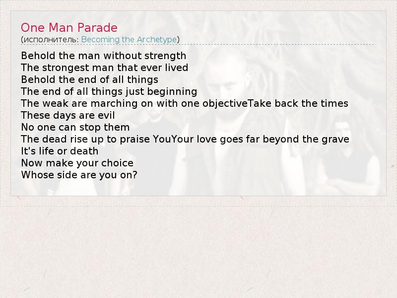 А как ты думаешь, о чем песня "One Man Parade" ?