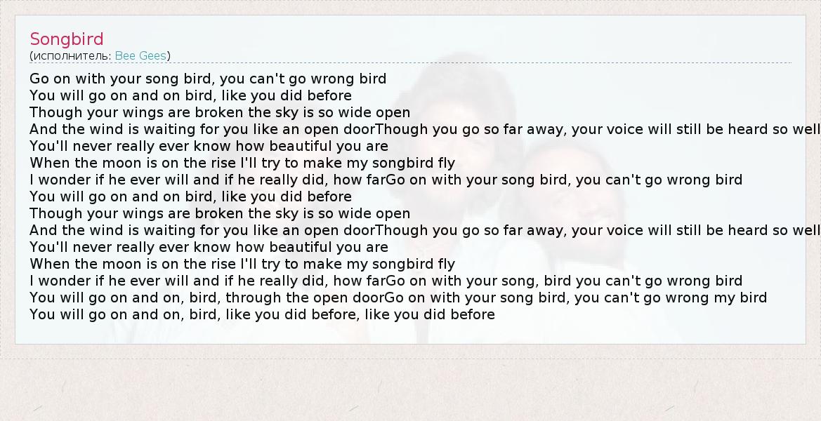 You will go on and on, bird, through the open doorGo on with your song bird, you can't go wrong my bird