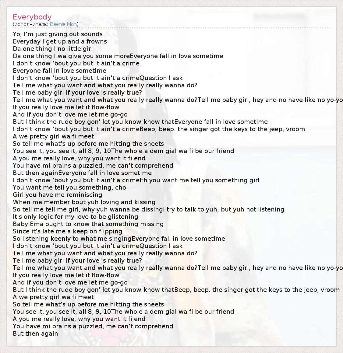Yo, I'm just giving out sounds Everyday I get up and a frowns Da one thing I no little girl Da one thing I wa give you some moreEveryone fall in love sometime I don't know 'bout you but it ain't a crime Everyone fall in love sometime I don't know 'bout you but it ain't a crimeQuestion I ask Tell me what you want and what you really really wanna do? Tell me baby girl if your love is really true? Tell me what you want and what you really really wanna do?Tell me baby girl, hey and no have like no yo-yo If you really love me let it flow-flow And if you don't love me let me go-go But I think the rude boy gon' let you know-know thatEveryone fall in love sometime I don't know 'bout you but it ain't a crimeBeep, beep. the singer got the keys to the jeep, vroom A we pretty girl wa fi meet So tell me what's up before me hitting the sheets You see it, you see it, all 8, 9, 10The whole a dem gial wa fi be our friend A you me really love, why you want it fi end You have mi brains a puzzled, me can't comprehend But then againEveryone fall in love sometime I don't know 'bout you but it ain't a crimeEh you want me tell you something girl You want me tell you something, cho Girl you have me reminiscing When me member bout yuh loving and kissing So tell me tell me girl, why yuh wanna be dissingI try to talk to yuh, but yuh not listening It's only logic for my love to be glistening Baby Ema ought to know that something missing Since it's late me a keep on flipping So listening keenly to what me singingEveryone fall in love sometime I don't know 'bout you but it ain't a crimeQuestion I ask Tell me what you want and what you really really wanna do? Tell me baby girl if your love is really true? Tell me what you want and what you really really wanna do?Tell me baby girl, hey and no have like no yo-yo If you really love me let it flow-flow And if you don't love me let me go-go But I think the rude boy gon' let you know-know thatBeep, beep. the singer got the keys to the jeep, vroom A we pretty girl wa fi meet So tell me what's up before me hitting the sheets You see it, you see it, all 8, 9, 10The whole a dem gial wa fi be our friend A you me really love, why you want it fi end You have mi brains a puzzled, me can't comprehend But then again