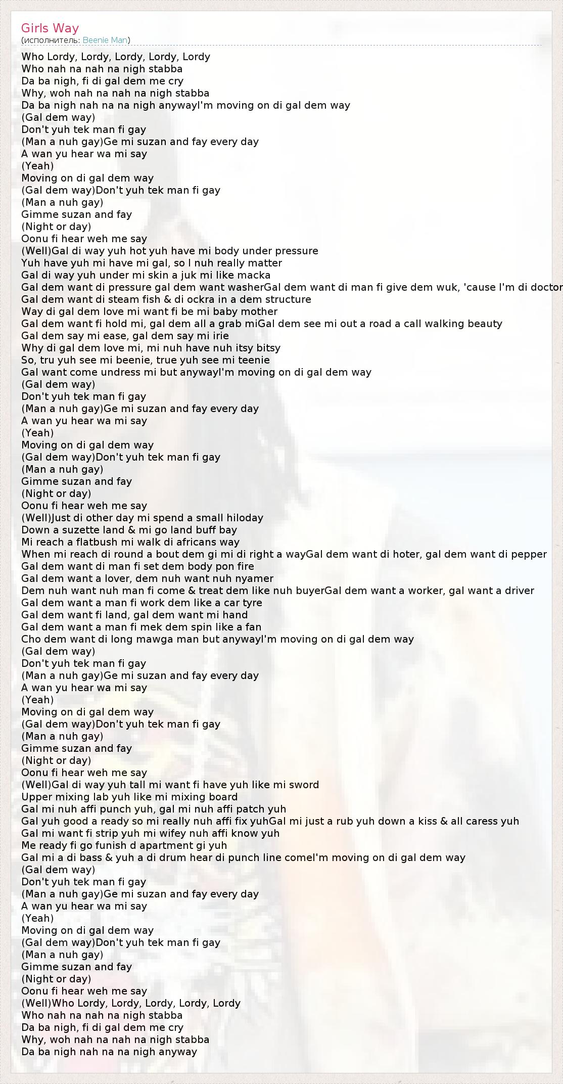 Da ba nigh nah na na nigh anywayI'm moving on di gal dem way