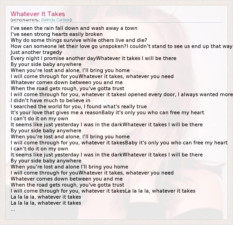 I've seen the rain fall down and wash away a town I've seen strong hearts easily broken Why do some things survive while others live and die? How can someone let their love go unspoken?I couldn't stand to see us end up that way Just another tragedy Every night I promise another dayWhatever it takes I will be there By your side baby anywhere When you're lost and alone, I'll bring you home I will come through for youWhatever it takes, whatever you need Whatever comes down between you and me When the road gets rough, you've gotta trust I will come through for you, whatever it takesI opened every door, I always wanted more I didn't have much to believe in I searched the world for you, I found what's really true It's your love that gives me a reasonBaby it's only you who can free my heart I can't do it on my own It seems like just yesterday I was in the darkWhatever it takes I will be there By your side baby anywhere When you're lost and alone, I'll bring you home I will come through for you, whatever it takesBaby it's only you who can free my heart I can't do it on my own It seems like just yesterday I was in the darkWhatever it takes I will be there By your side baby anywhere When you're lost and alone I'll bring you home I will come through for youWhatever it takes, whatever you need Whatever comes down between you and me When the road gets rough, you've gotta trust I will come through for you, whatever it takesLa la la la, whatever it takes La la la la, whatever it takes La la la la, whatever it takes ...