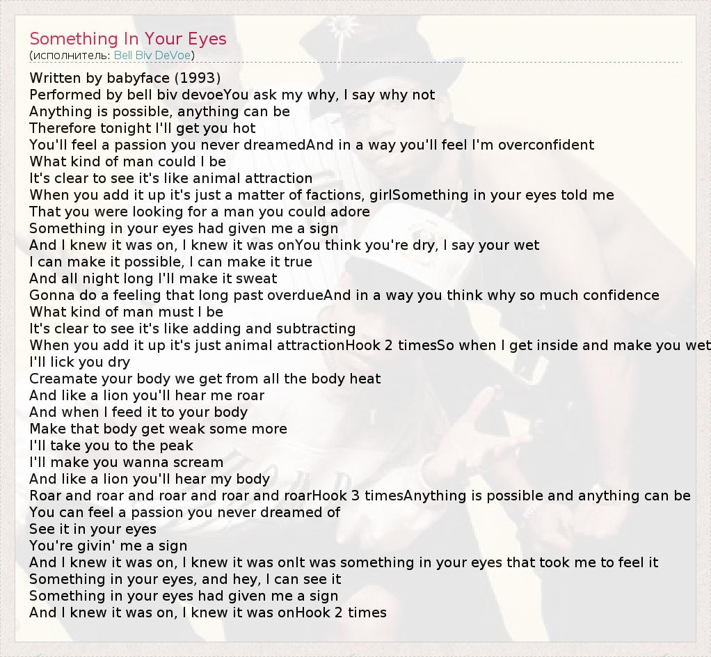 Written by babyface (1993) Performed by bell biv devoeYou ask my why, I say why not Anything is possible, anything can be Therefore tonight I'll get you hot You'll feel a passion you never dreamedAnd in a way you'll feel I'm overconfident What kind of man could I be It's clear to see it's like animal attraction When you add it up it's just a matter of factions, girlSomething in your eyes told me That you were looking for a man you could adore Something in your eyes had given me a sign And I knew it was on, I knew it was onYou think you're dry, I say your wet I can make it possible, I can make it true And all night long I'll make it sweat Gonna do a feeling that long past overdueAnd in a way you think why so much confidence What kind of man must I be It's clear to see it's like adding and subtracting When you add it up it's just animal attractionHook 2 timesSo when I get inside and make you wet I'll lick you dry Creamate your body we get from all the body heat And like a lion you'll hear me roar And when I feed it to your body Make that body get weak some more I'll take you to the peak I'll make you wanna scream And like a lion you'll hear my body Roar and roar and roar and roar and roarHook 3 timesAnything is possible and anything can be You can feel a passion you never dreamed of See it in your eyes You're givin' me a sign And I knew it was on, I knew it was onIt was something in your eyes that took me to feel it Something in your eyes, and hey, I can see it Something in your eyes had given me a sign And I knew it was on, I knew it was onHook 2 times