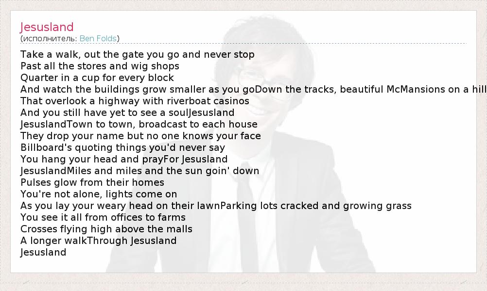 Это интересно:Ben Folds Five (Бен Фолдс Файв) Piano-pop-группа BEN FOLDS FIVE на самом деле никакие не BEN FOLDS FIVE, а скорее BEN FOLDS THREE, ведь Ben Folds (вокал, фоно), Robert Sledge (бас) и Darren Jesse (ударные) даже при самом нелепом раскладе не дадут в сумме пяти. Теперь попробуйте отгадать, какой вопрос чаще всего задают группе журналисты, которые, складывая 1+1+1, неизменно, упрямо, идиосинкразически получают сами знаете что. А как вы думаете,... продолжение