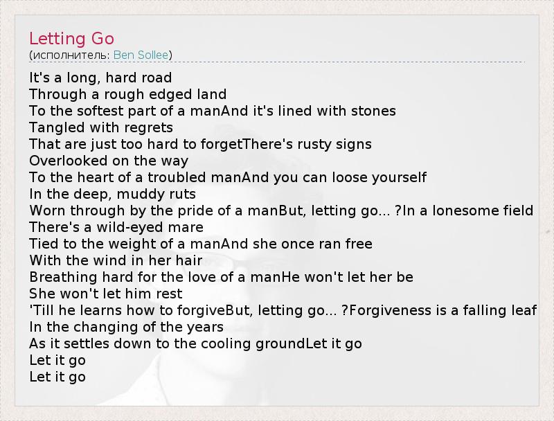 It's a long, hard road Through a rough edged land To the softest part of a manAnd it's lined with stones Tangled with regrets That are just too hard to forgetThere's rusty signs Overlooked on the way To the heart of a troubled manAnd you can loose yourself In the deep, muddy ruts Worn through by the pride of a manBut, letting go... ?In a lonesome field There's a wild-eyed mare Tied to the weight of a manAnd she once ran free With the wind in her hair Breathing hard for the love of a manHe won't let her be She won't let him rest 'Till he learns how to forgiveBut, letting go... ?Forgiveness is a falling leaf In the changing of the years As it settles down to the cooling groundLet it go Let it go Let it go