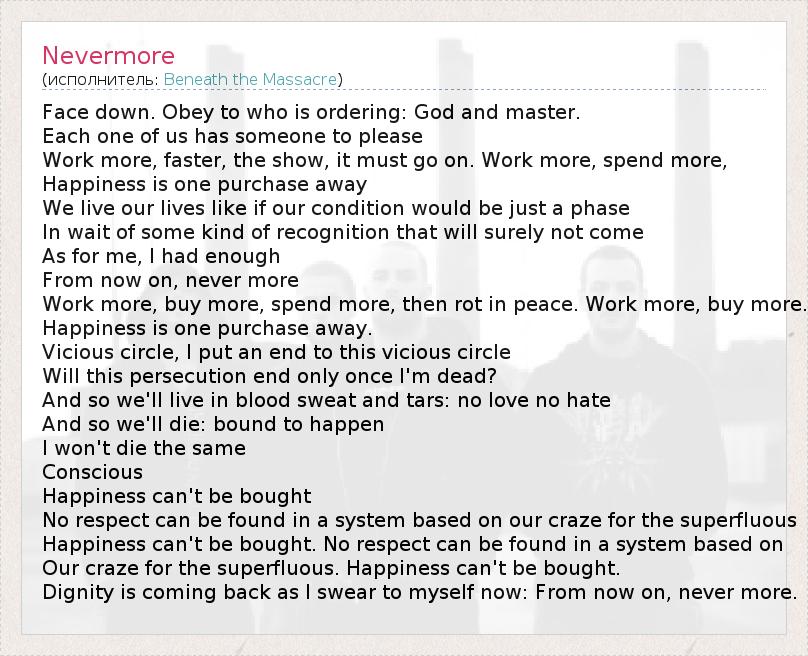 Это интересно:Beneath the Massacre - техникал дэт команда из Монреаля, Квебек, Канада. Их музыка частично инспирирована хардкором и разбавлена своеобразными брейкдаунами и грувовыми риффами. Их дебютный EP, "Evidence of Inequity", вышел в 2005 году на Galy Records. В раннем 2006 группа подписалась на Prosthetic Records и выпустила первый полноформатный альбом, "Mechanics of Dysfunction", 20-го февраля... продолжение