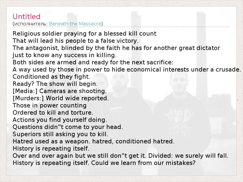 Это интересно:Beneath the Massacre - техникал дэт команда из Монреаля, Квебек, Канада. Их музыка частично инспирирована хардкором и разбавлена своеобразными брейкдаунами и грувовыми риффами. Их дебютный EP, "Evidence of Inequity", вышел в 2005 году на Galy Records. В раннем 2006 группа подписалась на Prosthetic Records и выпустила первый полноформатный альбом, "Mechanics of Dysfunction", 20-го февраля... продолжение