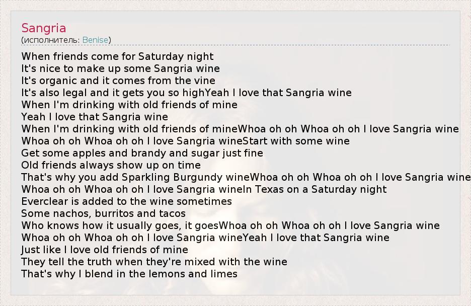 Whoa oh oh Whoa oh oh I love Sangria wineStart with some wine