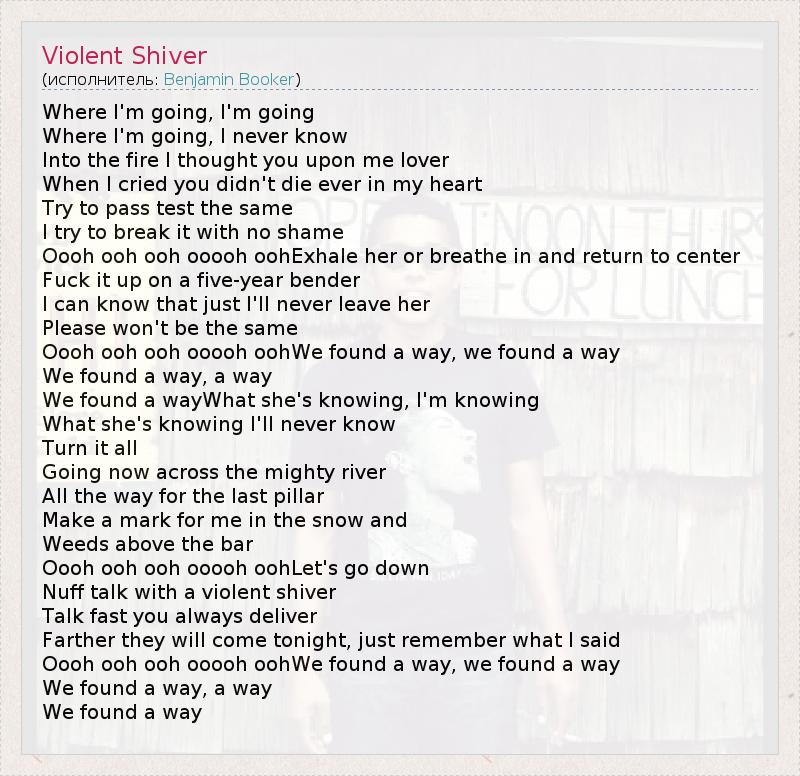 Where I'm going, I'm going Where I'm going, I never know Into the fire I thought you upon me lover When I cried you didn't die ever in my heart Try to pass test the same I try to break it with no shame Oooh ooh ooh ooooh oohExhale her or breathe in and return to center Fuck it up on a five-year bender I can know that just I'll never leave her Please won't be the same Oooh ooh ooh ooooh oohWe found a way, we found a way We found a way, a way We found a wayWhat she's knowing, I'm knowing What she's knowing I'll never know Turn it all Going now across the mighty river All the way for the last pillar Make a mark for me in the snow and Weeds above the bar Oooh ooh ooh ooooh oohLet's go down Nuff talk with a violent shiver Talk fast you always deliver Farther they will come tonight, just remember what I said Oooh ooh ooh ooooh oohWe found a way, we found a way We found a way, a way We found a way
