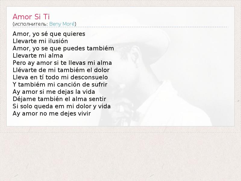 Амор , йо Се Que Quieres Llevarte миль Ilusion Амор , йо себе Que puedes tambiém Llevarte миль альма Перо ай си те Amor llevas миль альма Llévarte де миль tambiém эль боль Lleva Эн Ти TODO миль desconsuelo У tambiém миль canción де sufrir Ай си Amor мне Dejas La Vida Dejame también эль альма Sentir Си соло -Каида EM миль боль у Vida Да Amor нет мне dejes Vivir