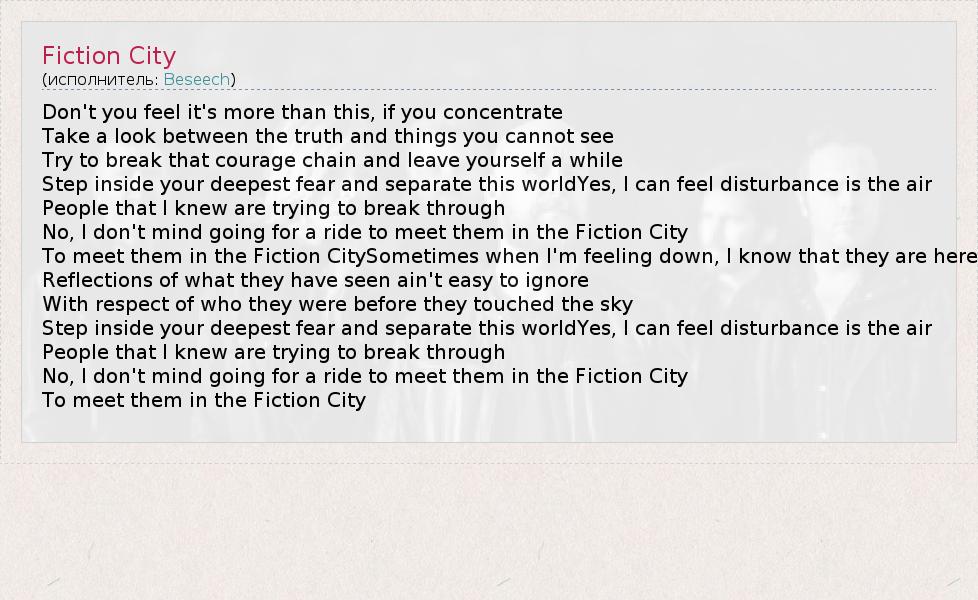 Don't you feel it's more than this, if you concentrate Take a look between the truth and things you cannot see Try to break that courage chain and leave yourself a while Step inside your deepest fear and separate this worldYes, I can feel disturbance is the air People that I knew are trying to break through No, I don't mind going for a ride to meet them in the Fiction City To meet them in the Fiction CitySometimes when I'm feeling down, I know that they are here Reflections of what they have seen ain't easy to ignore With respect of who they were before they touched the sky Step inside your deepest fear and separate this worldYes, I can feel disturbance is the air People that I knew are trying to break through No, I don't mind going for a ride to meet them in the Fiction City To meet them in the Fiction City