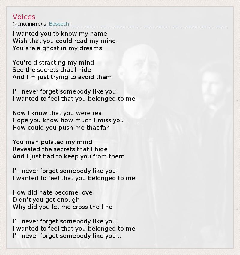 I wanted you to know my name Wish that you could read my mind You are a ghost in my dreams You're distracting my mind See the secrets that I hide And I'm just trying to avoid them I'll never forget somebody like you I wanted to feel that you belonged to me Now I know that you were real Hope you know how much I miss you How could you push me that far You manipulated my mind Revealed the secrets that I hide And I just had to keep you from them I'll never forget somebody like you I wanted to feel that you belonged to me How did hate become love Didn't you get enough Why did you let me cross the line I'll never forget somebody like you I wanted to feel that you belonged to me I'll never forget somebody like you...