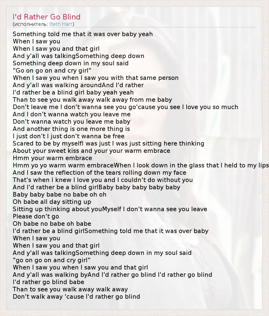 Something told me that it was over baby yeah When I saw you When I saw you and that girl And y'all was talkingSomething deep down Something deep down in my soul said "Go on go on and cry girl" When I saw you when I saw you with that same person And y'all was walking aroundAnd I'd rather I'd rather be a blind girl baby yeah yeah Than to see you walk away walk away from me baby Don't leave me I don't wanna see you go'cause you see I love you so much And I don't wanna watch you leave me Don't wanna watch you leave me baby And another thing is one more thing is I just don't I just don't wanna be free Scared to be by myselfI was just I was just sitting here thinking About your sweet kiss and your your warm embrace Hmm your warm embrace Hmm yo yo warm warm embraceWhen I look down in the glass that I held to my lips And I saw the reflection of the tears rolling down my face That's when I knew I love you and I couldn't do without you And I'd rather be a blind girlBaby baby baby baby baby Baby baby babe no babe oh oh Oh babe all day sitting up Sitting up thinking about youMyself I don't wanna see you leave Please don't go Oh babe no babe oh babe I'd rather be a blind girlSomething told me that it was over baby When I saw you When I saw you and that girl And y'all was talkingSomething deep down in my soul said "go on go on and cry girl" When I saw you when I saw you and that girl And y'all was walking byAnd I'd rather go blind I'd rather go blind I'd rather go blind babe Than to see you walk away walk away Don't walk away 'cause I'd rather go blind