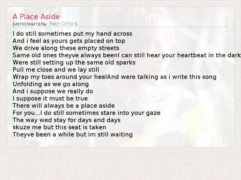 I do still sometimes put my hand across And i feel as yours gets placed on top We drive along these empty streets Same old ones theyve always beenI can still hear your heartbeat in the dark Were still setting up the same old sparks Pull me close and we lay still Wrap my toes around your heelAnd were talking as i write this song Unfolding as we go along And i suppose we really do I suppose it must be true There will always be a place aside For you...I do still sometimes stare into your gaze The way wed stay for days and days skuze me but this seat is taken Theyve been a while but im still waiting