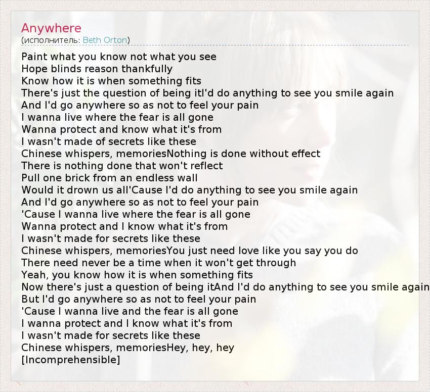 Paint what you know not what you see Hope blinds reason thankfully Know how it is when something fits There's just the question of being itI'd do anything to see you smile again And I'd go anywhere so as not to feel your pain I wanna live where the fear is all gone Wanna protect and know what it's from I wasn't made of secrets like these Chinese whispers, memoriesNothing is done without effect There is nothing done that won't reflect Pull one brick from an endless wall Would it drown us all'Cause I'd do anything to see you smile again And I'd go anywhere so as not to feel your pain 'Cause I wanna live where the fear is all gone Wanna protect and I know what it's from I wasn't made for secrets like these Chinese whispers, memoriesYou just need love like you say you do There need never be a time when it won't get through Yeah, you know how it is when something fits Now there's just a question of being itAnd I'd do anything to see you smile again But I'd go anywhere so as not to feel your pain 'Cause I wanna live and the fear is all gone I wanna protect and I know what it's from I wasn't made for secrets like these Chinese whispers, memoriesHey, hey, hey [Incomprehensible]