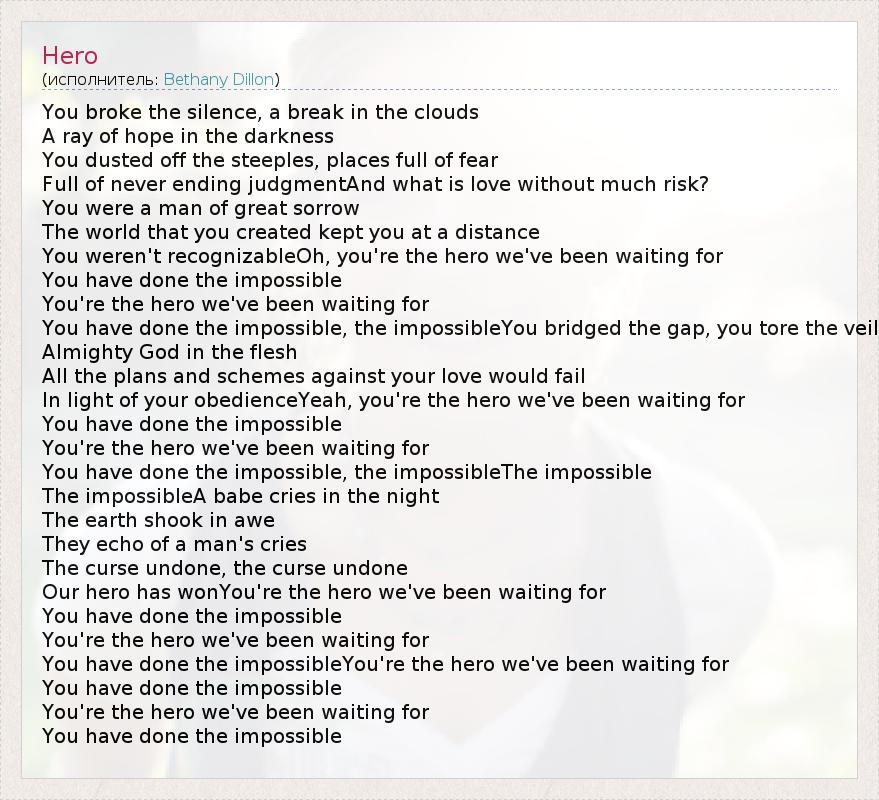 You broke the silence, a break in the clouds A ray of hope in the darkness You dusted off the steeples, places full of fear Full of never ending judgmentAnd what is love without much risk? You were a man of great sorrow The world that you created kept you at a distance You weren't recognizableOh, you're the hero we've been waiting for You have done the impossible You're the hero we've been waiting for You have done the impossible, the impossibleYou bridged the gap, you tore the veil Almighty God in the flesh All the plans and schemes against your love would fail In light of your obedienceYeah, you're the hero we've been waiting for You have done the impossible You're the hero we've been waiting for You have done the impossible, the impossibleThe impossible The impossibleA babe cries in the night The earth shook in awe They echo of a man's cries The curse undone, the curse undone Our hero has wonYou're the hero we've been waiting for You have done the impossible You're the hero we've been waiting for You have done the impossibleYou're the hero we've been waiting for You have done the impossible You're the hero we've been waiting for You have done the impossible