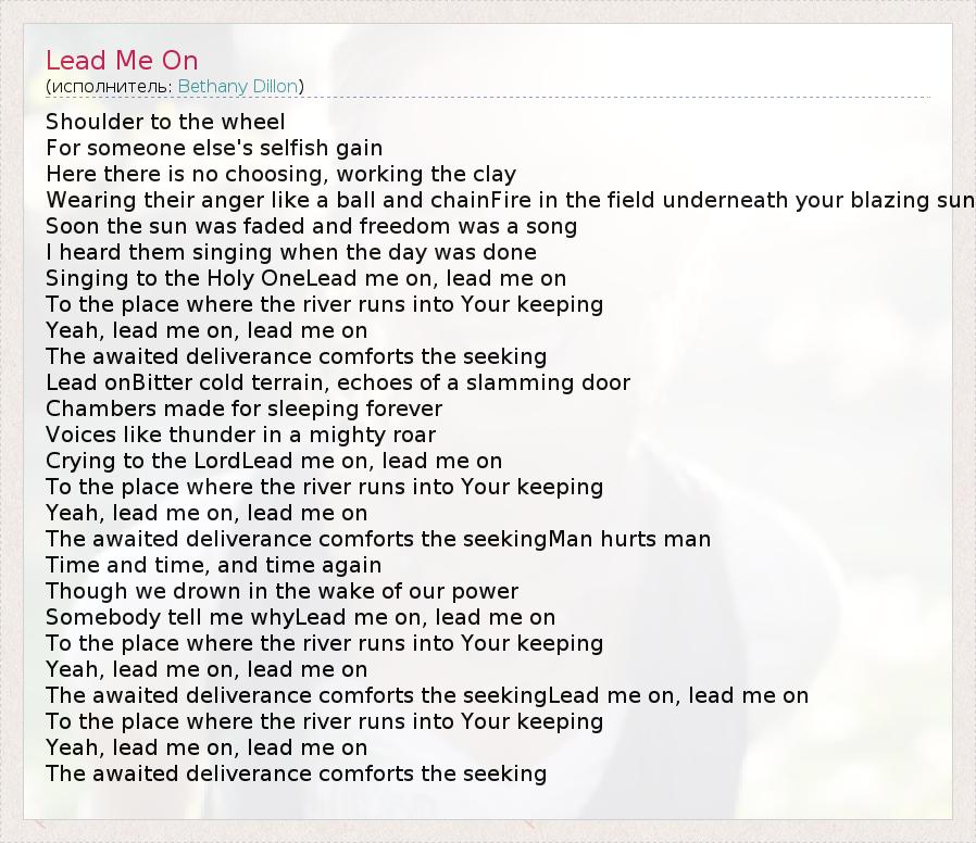 Shoulder to the wheel For someone else's selfish gain Here there is no choosing, working the clay Wearing their anger like a ball and chainFire in the field underneath your blazing sun Soon the sun was faded and freedom was a song I heard them singing when the day was done Singing to the Holy OneLead me on, lead me on To the place where the river runs into Your keeping Yeah, lead me on, lead me on The awaited deliverance comforts the seeking Lead onBitter cold terrain, echoes of a slamming door Chambers made for sleeping forever Voices like thunder in a mighty roar Crying to the LordLead me on, lead me on To the place where the river runs into Your keeping Yeah, lead me on, lead me on The awaited deliverance comforts the seekingMan hurts man Time and time, and time again Though we drown in the wake of our power Somebody tell me whyLead me on, lead me on To the place where the river runs into Your keeping Yeah, lead me on, lead me on The awaited deliverance comforts the seekingLead me on, lead me on To the place where the river runs into Your keeping Yeah, lead me on, lead me on The awaited deliverance comforts the seeking
