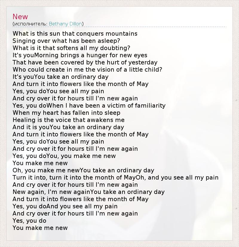 What is this sun that conquers mountains Singing over what has been asleep? What is it that softens all my doubting? It's youMorning brings a hunger for new eyes That have been covered by the hurt of yesterday Who could create in me the vision of a little child? It's youYou take an ordinary day And turn it into flowers like the month of May Yes, you doYou see all my pain And cry over it for hours till I'm new again Yes, you doWhen I have been a victim of familiarity When my heart has fallen into sleep Healing is the voice that awakens me And it is youYou take an ordinary day And turn it into flowers like the month of May Yes, you doYou see all my pain And cry over it for hours till I'm new again Yes, you doYou, you make me new You make me new Oh, you make me newYou take an ordinary day Turn it into, turn it into the month of MayOh, and you see all my pain And cry over it for hours till I'm new again New again, I'm new againYou take an ordinary day And turn it into flowers like the month of May Yes, you doAnd you see all my pain And cry over it for hours till I'm new again Yes, you do You make me new