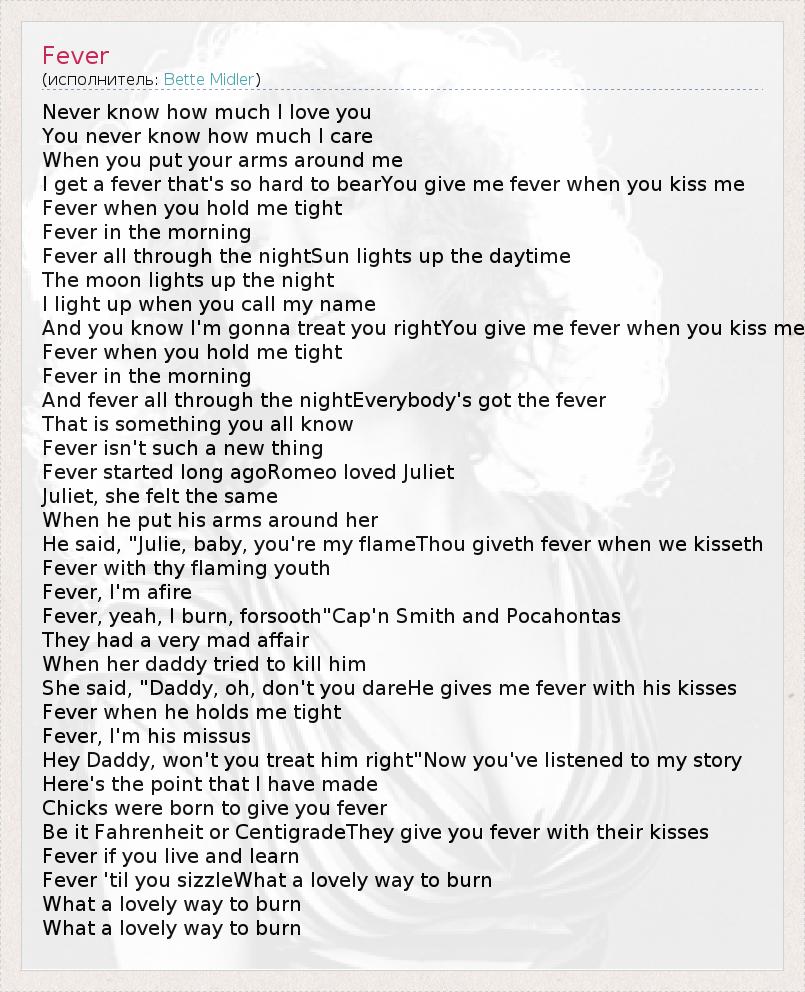 I get a fever that's so hard to bearYou give me fever when you kiss me